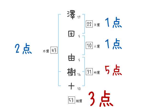 総運![]() | 澤田由樹十さんの総運は53画の3つ星!やや見栄っ張りで虚栄心がある。散財に注意。 あなたの人生を表す1番重要な運勢です。生涯を通じて影響する総合運となり、主に50歳以降の晩年期に影響を及ぼします。 |