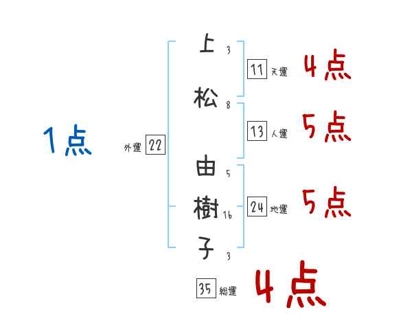 天運![]() | 上松由樹子さんの天運は11画の4つ星!着実に富や地位を得る幸運な人生。 家系が持つ宿命的な運勢を表します。祖先から受け継いだ苗字ですので自分の力が及びません。家柄を象徴します。 |