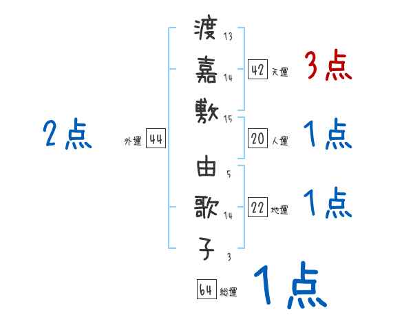 地運![]() | 渡嘉敷由歌子さんの地運は22画の1つ星!努力することが苦手ないっぽう手先が器用。芸術性にも優れる。 個性を表す基礎的な運勢です。性格形成や対人関係、行動力など家庭環境に影響されます。主に誕生してから20歳くらいまでの若年期の運勢を表します。 |
