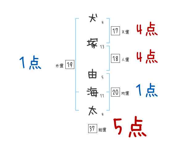 | 地運  | 犬塚由海太さんの地運は20画の1つ星!社交が苦手。人とは違った才能があり波乱万丈な人生かも。個性を表す基礎的な運勢です。性格形成や対人関係、行動力など家庭環境に影響されます。主に誕生してから20歳くらいまでの若年期の運勢を表します。 |