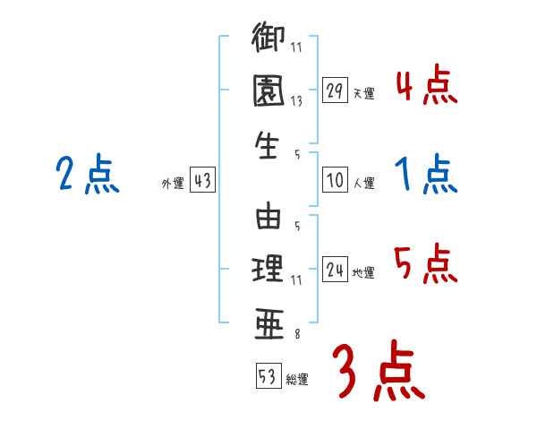 総運![]() | 御園生由理亜さんの総運は53画の3つ星!やや見栄っ張りで虚栄心がある。散財に注意。 あなたの人生を表す1番重要な運勢です。生涯を通じて影響する総合運となり、主に50歳以降の晩年期に影響を及ぼします。 |