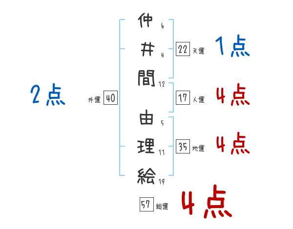 総運![]() | 仲井間由理絵さんの総運は57画の4つ星!向上心があり人望がある。地位を得る。 あなたの人生を表す1番重要な運勢です。生涯を通じて影響する総合運となり、主に50歳以降の晩年期に影響を及ぼします。 |