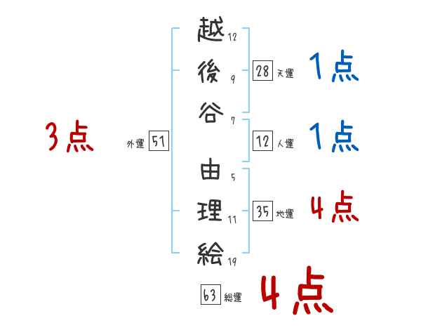 総運![]() | 越後谷由理絵さんの総運は63画の4つ星!家庭運がよく順調な生活。温和な性格。 あなたの人生を表す1番重要な運勢です。生涯を通じて影響する総合運となり、主に50歳以降の晩年期に影響を及ぼします。 |