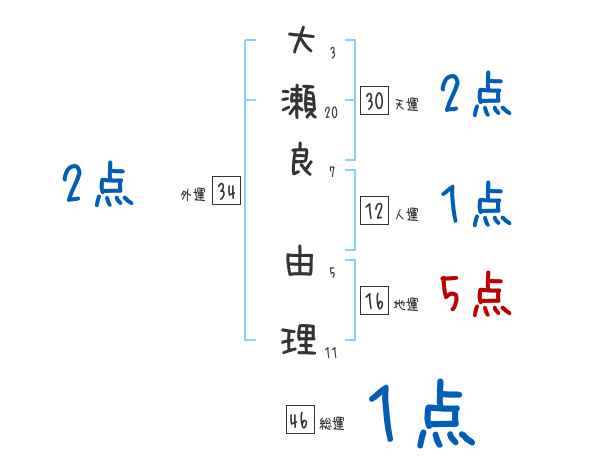 天運![]() | 大瀬良由理さんの天運は30画の2つ星!浮き沈みの激しさに注意しましょう。 家系が持つ宿命的な運勢を表します。祖先から受け継いだ苗字ですので自分の力が及びません。家柄を象徴します。 |