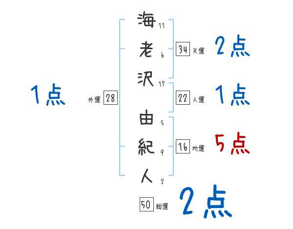 外運![]() | 海老沢由紀人さんの外運は28画の1つ星!家庭環境に注意。スポーツで活躍できる能力があるかも。 生活面を象徴する運勢です。外部から受ける影響力を表し、結婚運、家庭運や職場、環境への順応性を表します。 |