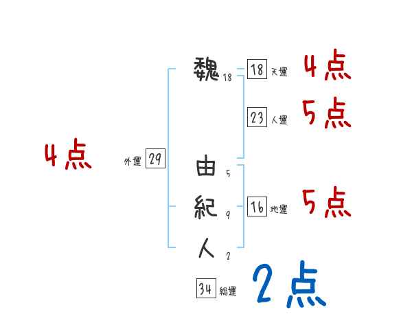 外運![]() | 魏由紀人さんの外運は29画の4つ星!完全主義で才能がある。厳格な心の持ち主。 生活面を象徴する運勢です。外部から受ける影響力を表し、結婚運、家庭運や職場、環境への順応性を表します。 |
