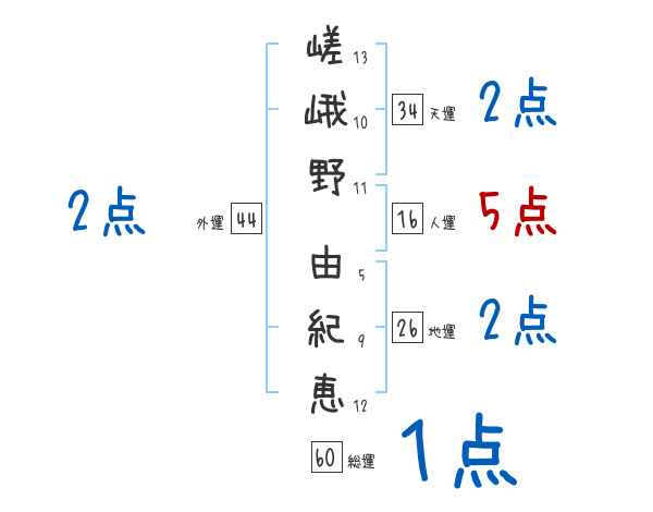 人運![]() | 嵯峨野由紀恵さんの人運は16画の5つ星!人望が厚く大きく発展する。逆転成功が見える。 性格や才能などを表す2番目に重要な運勢です。人間関係や協調性、社会的な成功に影響します。主に20歳から50歳ぐらいまでの中年期の運勢を表します。 |