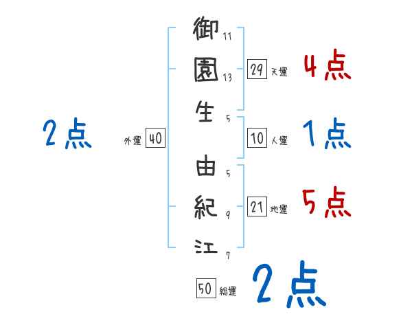 総運![]() | 御園生由紀江さんの総運は50画の2つ星!浮き沈みが激しく不安定。しりすぼみに衰退しやすいので注意しましょう。 あなたの人生を表す1番重要な運勢です。生涯を通じて影響する総合運となり、主に50歳以降の晩年期に影響を及ぼします。 |