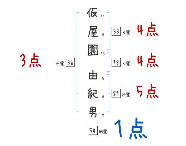 総運![]() | 仮屋園由紀男さんの総運は54画の1つ星!トラブルが多いかも。周りをよく見て協調して過ごしましょう。 あなたの人生を表す1番重要な運勢です。生涯を通じて影響する総合運となり、主に50歳以降の晩年期に影響を及ぼします。 |