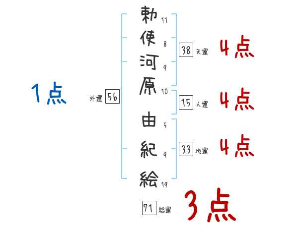天運![]() | 勅使河原由紀絵さんの天運は38画の4つ星!温厚な性格で技術的な才能を発揮する。職人的な仕事に向いている。 家系が持つ宿命的な運勢を表します。祖先から受け継いだ苗字ですので自分の力が及びません。家柄を象徴します。 |