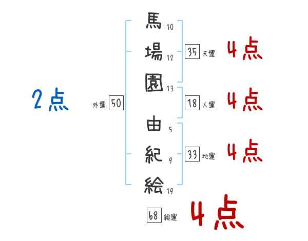 天運![]() | 馬場園由紀絵さんの天運は35画の4つ星!温厚な性格で感受性が高い。穏和な性格で人望が厚い。 家系が持つ宿命的な運勢を表します。祖先から受け継いだ苗字ですので自分の力が及びません。家柄を象徴します。 |