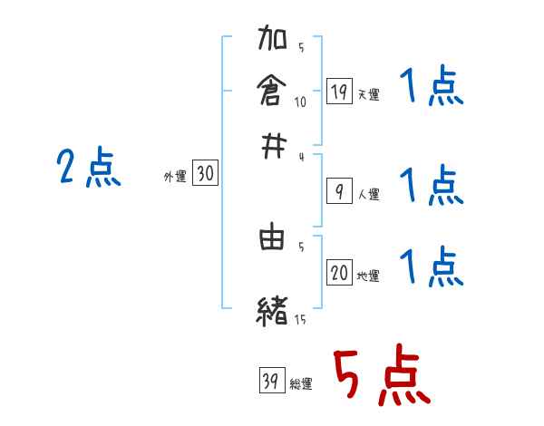 天運![]() | 加倉井由緒さんの天運は19画の1つ星!優れた才能を持ちますが、協調性が足りないことも。周りの人と協力する事を意識しましょう。 家系が持つ宿命的な運勢を表します。祖先から受け継いだ苗字ですので自分の力が及びません。家柄を象徴します。 |