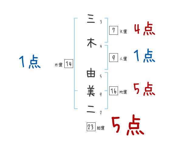天運![]() | 三木由美二さんの天運は7画の4つ星!強い意志や信念を持ち独立心が強い。自立する。 家系が持つ宿命的な運勢を表します。祖先から受け継いだ苗字ですので自分の力が及びません。家柄を象徴します。 |
