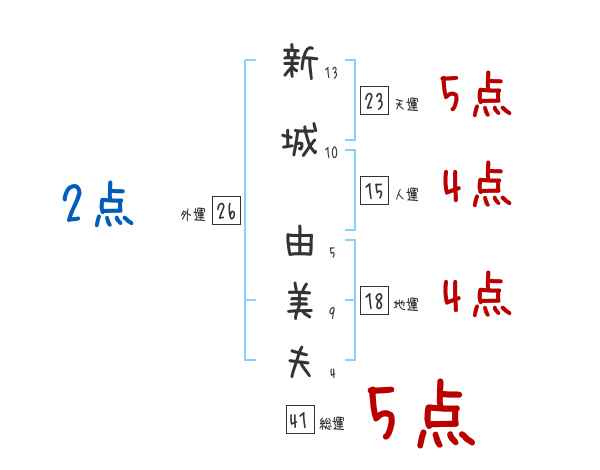 天運![]() | 新城由美夫さんの天運は23画の5つ星!想像力に優れ活力がある。一代で成功し名誉を手に入れる。 家系が持つ宿命的な運勢を表します。祖先から受け継いだ苗字ですので自分の力が及びません。家柄を象徴します。 |