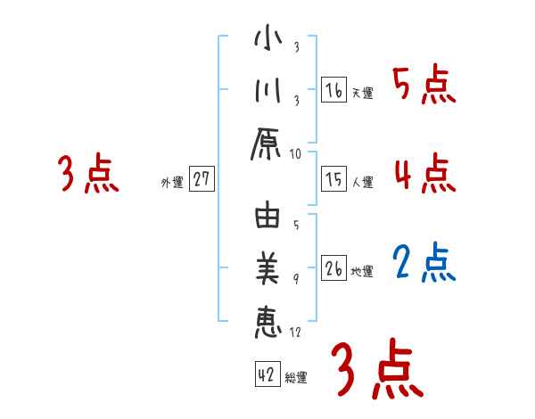 天運![]() | 小川原由美恵さんの天運は16画の5つ星!人望が厚く大きく発展する。逆転成功が見える。 家系が持つ宿命的な運勢を表します。祖先から受け継いだ苗字ですので自分の力が及びません。家柄を象徴します。 |