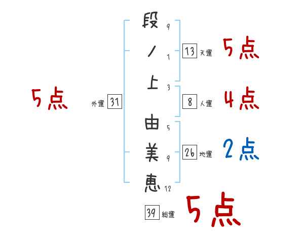 天運![]() | 段ノ上由美恵さんの天運は13画の5つ星!才能に恵まれ人気がある。名声を手に入れる。円満な人生。 家系が持つ宿命的な運勢を表します。祖先から受け継いだ苗字ですので自分の力が及びません。家柄を象徴します。 |