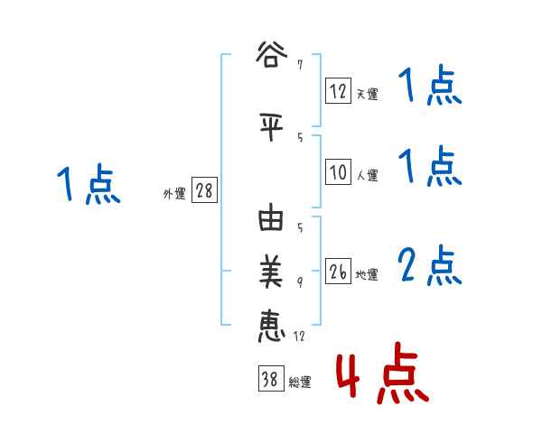 外運![]() | 谷平由美恵さんの外運は28画の1つ星!家庭環境に注意。スポーツで活躍できる能力があるかも。 生活面を象徴する運勢です。外部から受ける影響力を表し、結婚運、家庭運や職場、環境への順応性を表します。 |