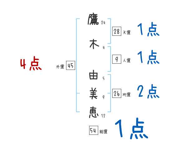 天運![]() | 鷹木由美恵さんの天運は28画の1つ星!家庭環境に注意。スポーツで活躍できる能力があるかも。 家系が持つ宿命的な運勢を表します。祖先から受け継いだ苗字ですので自分の力が及びません。家柄を象徴します。 |