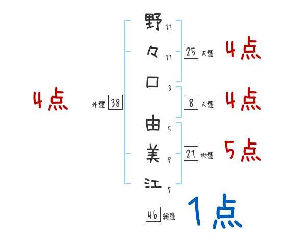 総運![]() | 野々口由美江さんの総運は46画の1つ星!迷走することが多く苦労するかも。目先のことにとらわれないように。 あなたの人生を表す1番重要な運勢です。生涯を通じて影響する総合運となり、主に50歳以降の晩年期に影響を及ぼします。 |