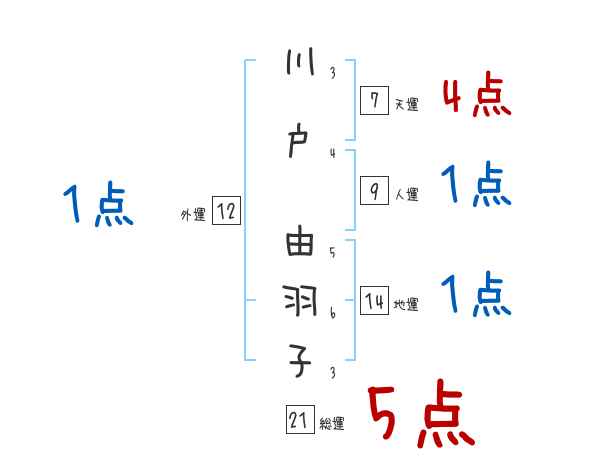 天運![]() | 川戸由羽子さんの天運は7画の4つ星!強い意志や信念を持ち独立心が強い。自立する。 家系が持つ宿命的な運勢を表します。祖先から受け継いだ苗字ですので自分の力が及びません。家柄を象徴します。 |