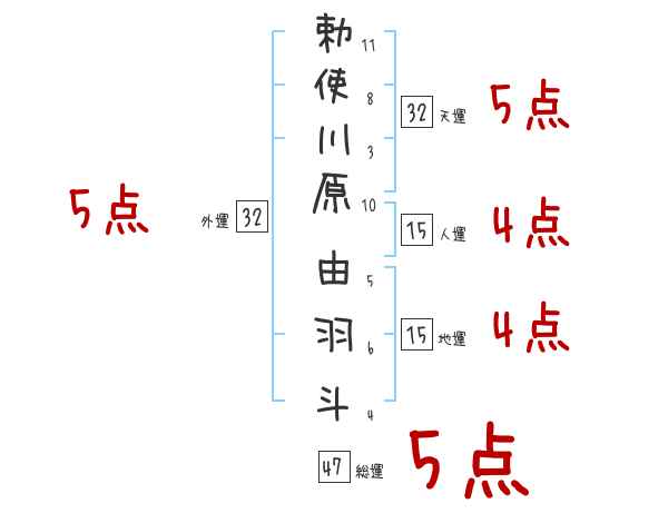 外運![]() | 勅使川原由羽斗さんの外運は32画の5つ星!柔軟性があり成功する。チャンスが多く金運が良い。 生活面を象徴する運勢です。外部から受ける影響力を表し、結婚運、家庭運や職場、環境への順応性を表します。 |