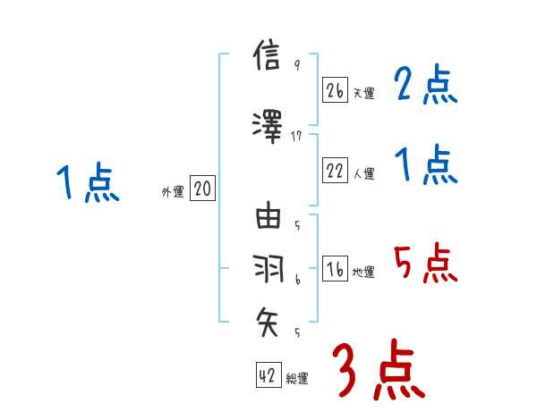 天運![]() | 信澤由羽矢さんの天運は26画の2つ星!波瀾万丈かも。信頼できる人を大事にしましょう。 家系が持つ宿命的な運勢を表します。祖先から受け継いだ苗字ですので自分の力が及びません。家柄を象徴します。 |