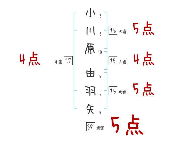 総運![]() | 小川原由羽矢さんの総運は32画の5つ星!柔軟性があり成功する。チャンスが多く金運が良い。 あなたの人生を表す1番重要な運勢です。生涯を通じて影響する総合運となり、主に50歳以降の晩年期に影響を及ぼします。 |