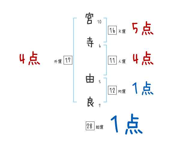 総運![]() | 宮寺由良さんの総運は28画の1つ星!家庭環境に注意。スポーツで活躍できる能力があるかも。 あなたの人生を表す1番重要な運勢です。生涯を通じて影響する総合運となり、主に50歳以降の晩年期に影響を及ぼします。 |
