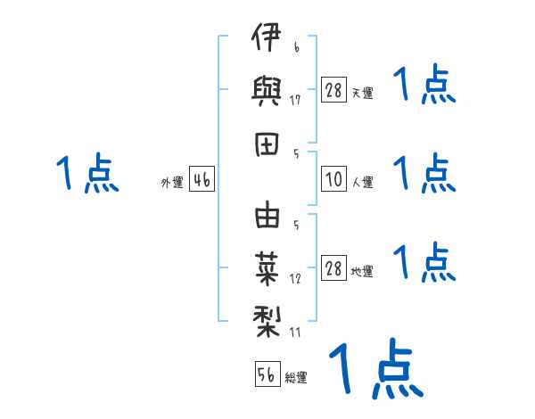 天運![]() | 伊與田由菜梨さんの天運は28画の1つ星!家庭環境に注意。スポーツで活躍できる能力があるかも。 家系が持つ宿命的な運勢を表します。祖先から受け継いだ苗字ですので自分の力が及びません。家柄を象徴します。 |