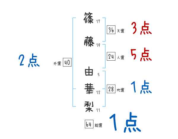 外運![]() | 篠藤由華梨さんの外運は40画の2つ星!自信過剰で物事に固執するためトラブルに注意。 生活面を象徴する運勢です。外部から受ける影響力を表し、結婚運、家庭運や職場、環境への順応性を表します。 |