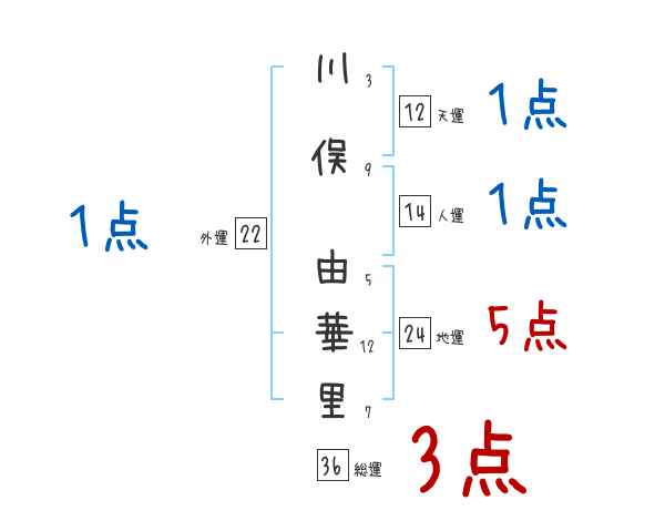 総運![]() | 川俣由華里さんの総運は36画の3つ星!先見性が豊かです。多少神経質で苦労することも。 あなたの人生を表す1番重要な運勢です。生涯を通じて影響する総合運となり、主に50歳以降の晩年期に影響を及ぼします。 |