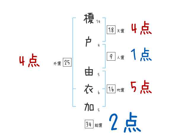 天運![]() | 榎戸由衣加さんの天運は18画の4つ星!情熱的で剛気。忍耐力があり信頼される。 家系が持つ宿命的な運勢を表します。祖先から受け継いだ苗字ですので自分の力が及びません。家柄を象徴します。 |
