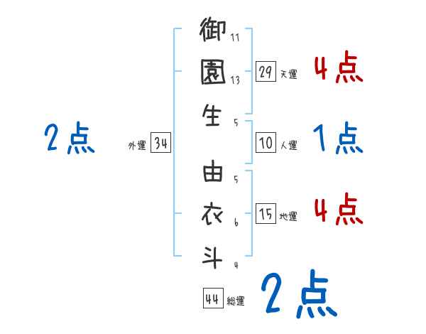 総運![]() | 御園生由衣斗さんの総運は44画の2つ星!誠実で慎重な性格。物事を考えすぎないように注意しましょう。 あなたの人生を表す1番重要な運勢です。生涯を通じて影響する総合運となり、主に50歳以降の晩年期に影響を及ぼします。 |