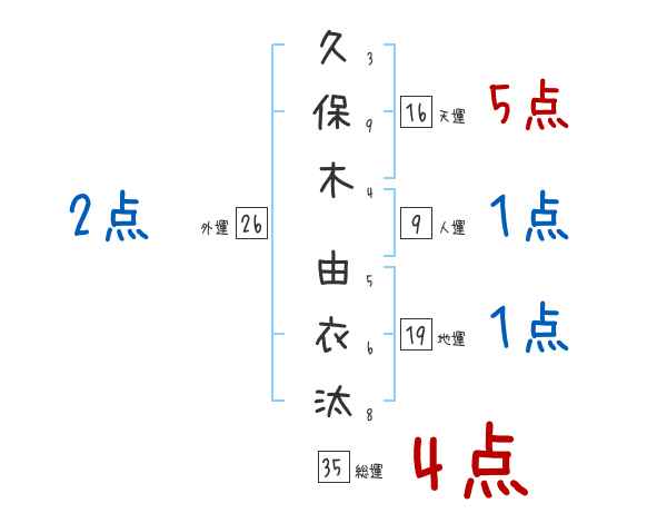 外運![]() | 久保木由衣汰さんの外運は26画の2つ星!波瀾万丈かも。信頼できる人を大事にしましょう。 生活面を象徴する運勢です。外部から受ける影響力を表し、結婚運、家庭運や職場、環境への順応性を表します。 |