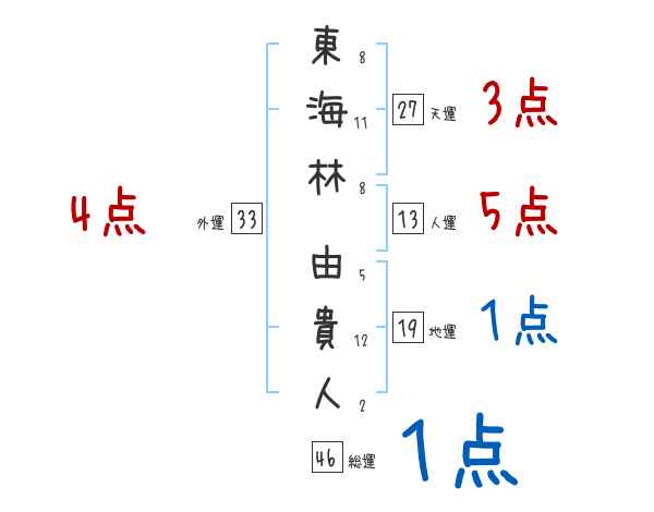 総運![]() | 東海林由貴人さんの総運は46画の1つ星!迷走することが多く苦労するかも。目先のことにとらわれないように。 あなたの人生を表す1番重要な運勢です。生涯を通じて影響する総合運となり、主に50歳以降の晩年期に影響を及ぼします。 |
