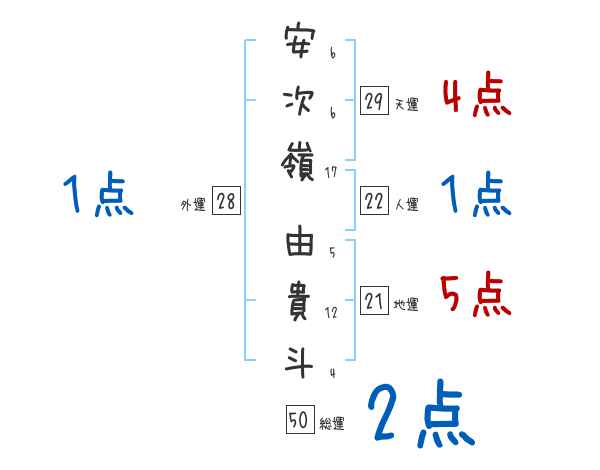 天運![]() | 安次嶺由貴斗さんの天運は29画の4つ星!完全主義で才能がある。厳格な心の持ち主。 家系が持つ宿命的な運勢を表します。祖先から受け継いだ苗字ですので自分の力が及びません。家柄を象徴します。 |