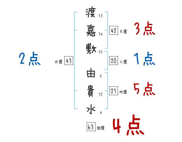 総運![]() | 渡嘉敷由貴水さんの総運は63画の4つ星!家庭運がよく順調な生活。温和な性格。 あなたの人生を表す1番重要な運勢です。生涯を通じて影響する総合運となり、主に50歳以降の晩年期に影響を及ぼします。 |