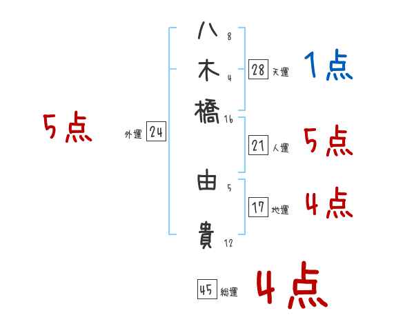 外運![]() | 八木橋由貴さんの外運は24画の5つ星!家庭運が良く順調な人生。金運にも恵まれる。 生活面を象徴する運勢です。外部から受ける影響力を表し、結婚運、家庭運や職場、環境への順応性を表します。 |