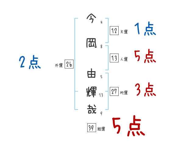 総運![]() | 今岡由輝哉さんの総運は39画の5つ星!社交性に優れ人望が厚い。人の上に立ち成功する。 あなたの人生を表す1番重要な運勢です。生涯を通じて影響する総合運となり、主に50歳以降の晩年期に影響を及ぼします。 |