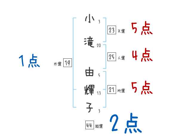天運![]() | 小滝由輝子さんの天運は23画の5つ星!想像力に優れ活力がある。一代で成功し名誉を手に入れる。 家系が持つ宿命的な運勢を表します。祖先から受け継いだ苗字ですので自分の力が及びません。家柄を象徴します。 |