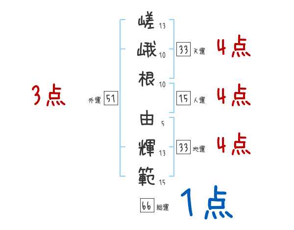 総運![]() | 嵯峨根由輝範さんの総運は66画の1つ星!迷うことが多く挫折しやすい傾向が。辛抱強く物事に取り組みましょう。 あなたの人生を表す1番重要な運勢です。生涯を通じて影響する総合運となり、主に50歳以降の晩年期に影響を及ぼします。 |