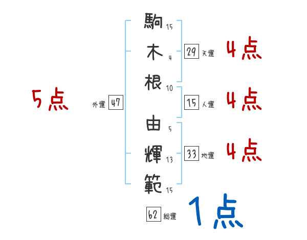 外運![]() | 駒木根由輝範さんの外運は47画の5つ星!実力が開花し発展する円満な人生。財に恵まれる。 生活面を象徴する運勢です。外部から受ける影響力を表し、結婚運、家庭運や職場、環境への順応性を表します。 |