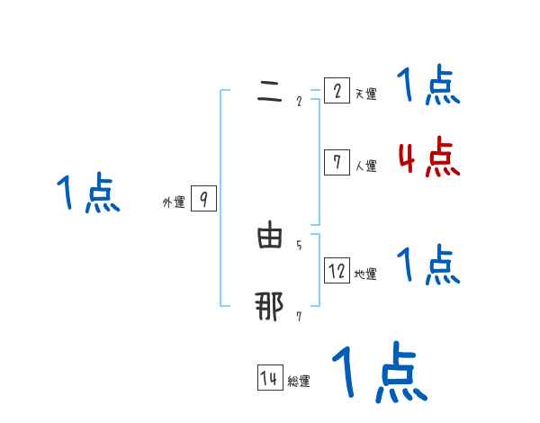 天運![]() | 二由那さんの天運は2画の1つ星!優しいですが積極性や意思の強さに欠ける傾向があります。家庭環境の乱れに注意しましょう。 家系が持つ宿命的な運勢を表します。祖先から受け継いだ苗字ですので自分の力が及びません。家柄を象徴します。 |