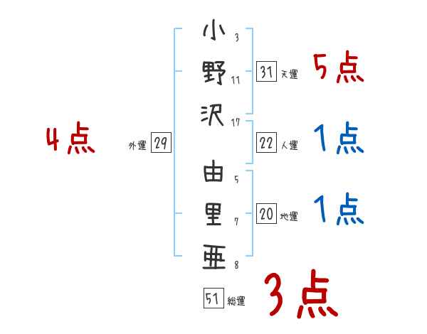 総運![]() | 小野沢由里亜さんの総運は51画の3つ星!変化が激しく、危険に注意。堅実な性格。 あなたの人生を表す1番重要な運勢です。生涯を通じて影響する総合運となり、主に50歳以降の晩年期に影響を及ぼします。 |