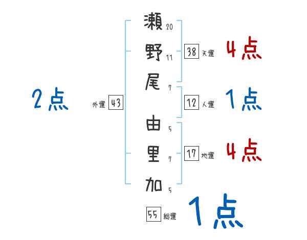 総運![]() | 瀬野尾由里加さんの総運は55画の1つ星!欲張りな性格で軽率な行動に注意しましょう。病気に気をつけて。 あなたの人生を表す1番重要な運勢です。生涯を通じて影響する総合運となり、主に50歳以降の晩年期に影響を及ぼします。 |