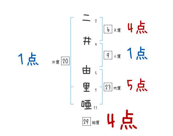 天運![]() | 二井由里唖さんの天運は6画の4つ星!慎重な努力家で信頼を得る。誠実な精神で向上心に優れる。 家系が持つ宿命的な運勢を表します。祖先から受け継いだ苗字ですので自分の力が及びません。家柄を象徴します。 |