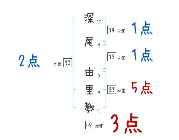 外運![]() | 深尾由里教さんの外運は30画の2つ星!浮き沈みの激しさに注意しましょう。 生活面を象徴する運勢です。外部から受ける影響力を表し、結婚運、家庭運や職場、環境への順応性を表します。 |