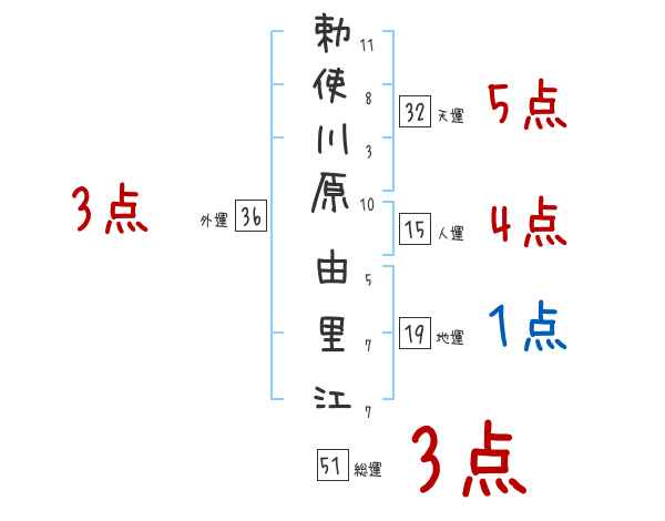 外運![]() | 勅使川原由里江さんの外運は36画の3つ星!先見性が豊かです。多少神経質で苦労することも。 生活面を象徴する運勢です。外部から受ける影響力を表し、結婚運、家庭運や職場、環境への順応性を表します。 |