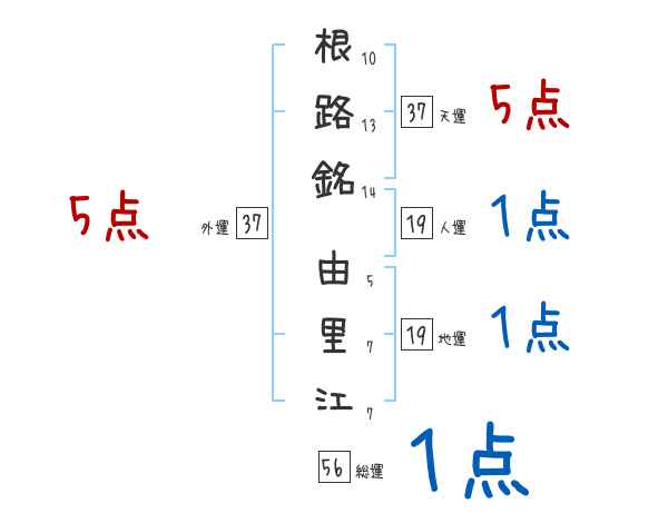 外運![]() | 根路銘由里江さんの外運は37画の5つ星!努力家で順応性に優れる。現実的な考え方ができ忠実に物事をこなす。 生活面を象徴する運勢です。外部から受ける影響力を表し、結婚運、家庭運や職場、環境への順応性を表します。 |