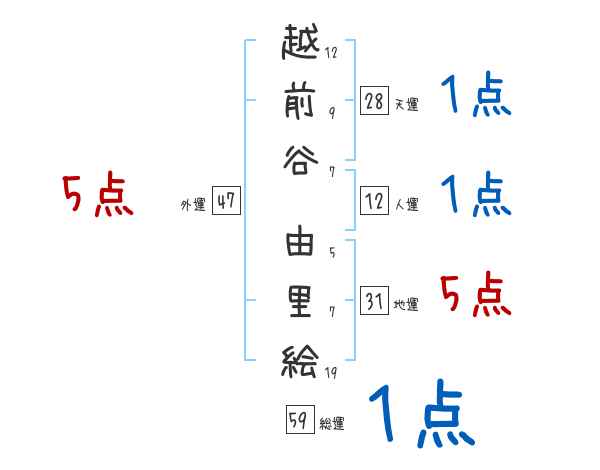 天運![]() | 越前谷由里絵さんの天運は28画の1つ星!家庭環境に注意。スポーツで活躍できる能力があるかも。 家系が持つ宿命的な運勢を表します。祖先から受け継いだ苗字ですので自分の力が及びません。家柄を象徴します。 |
